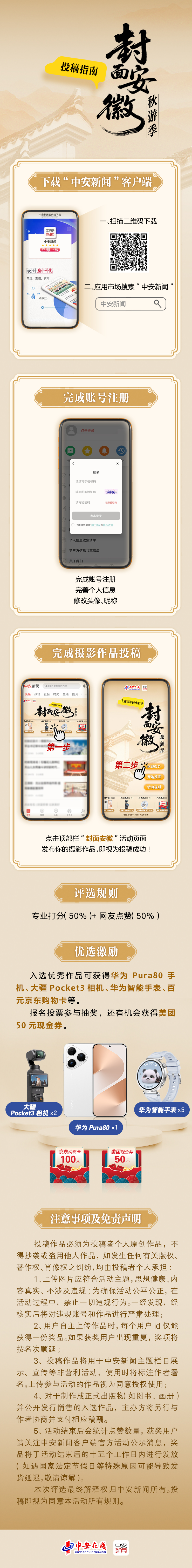 “封面安徽”系列主題攝影征集活動是由中安在線、中安新聞客戶端主辦,安徽省攝影家協會指導,活動立足于安徽獨特的自然風光與人文底蘊,通過每日精選影像內容,全方位展現江淮大地的自然之美、人文之韻和發展之新。本次“秋游季”投稿的優秀作品將同步發布至“封面安徽”進行專題展示,活動還準備了手機、相機、智能手表等獎勵,無論你是專業攝影師、攝影發燒友,還是隨手記錄生活的手機黨,只要你熱愛安徽,捕捉到打動人的瞬間,就是我們要找的“封面攝影師”!